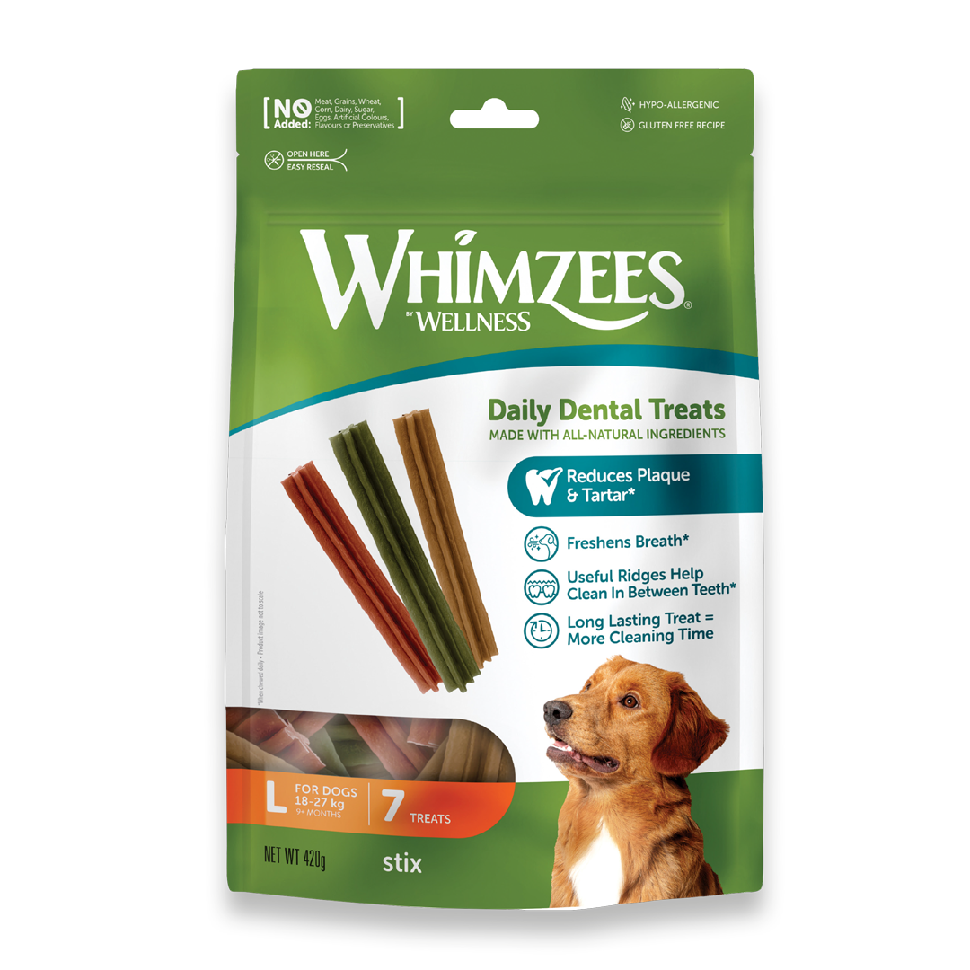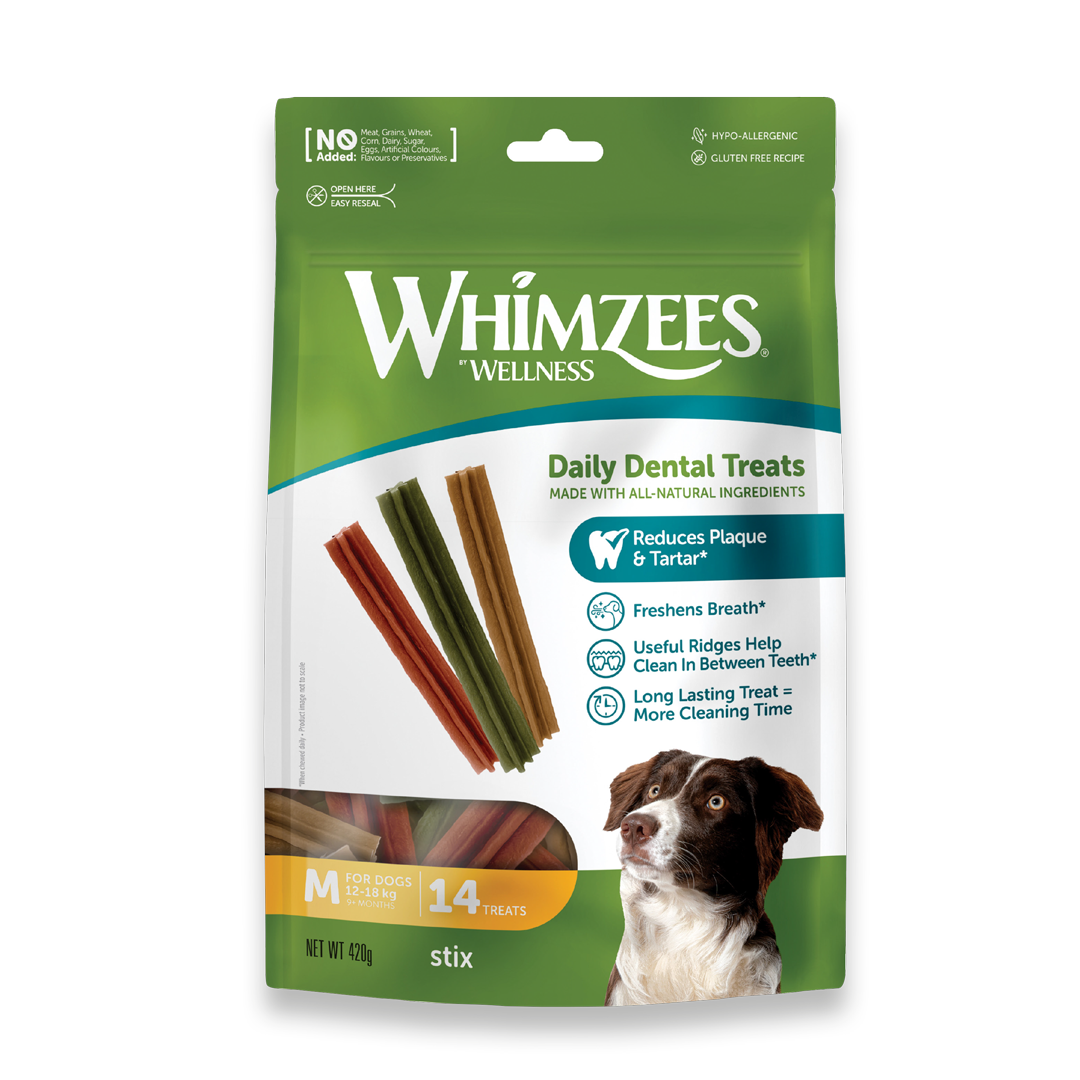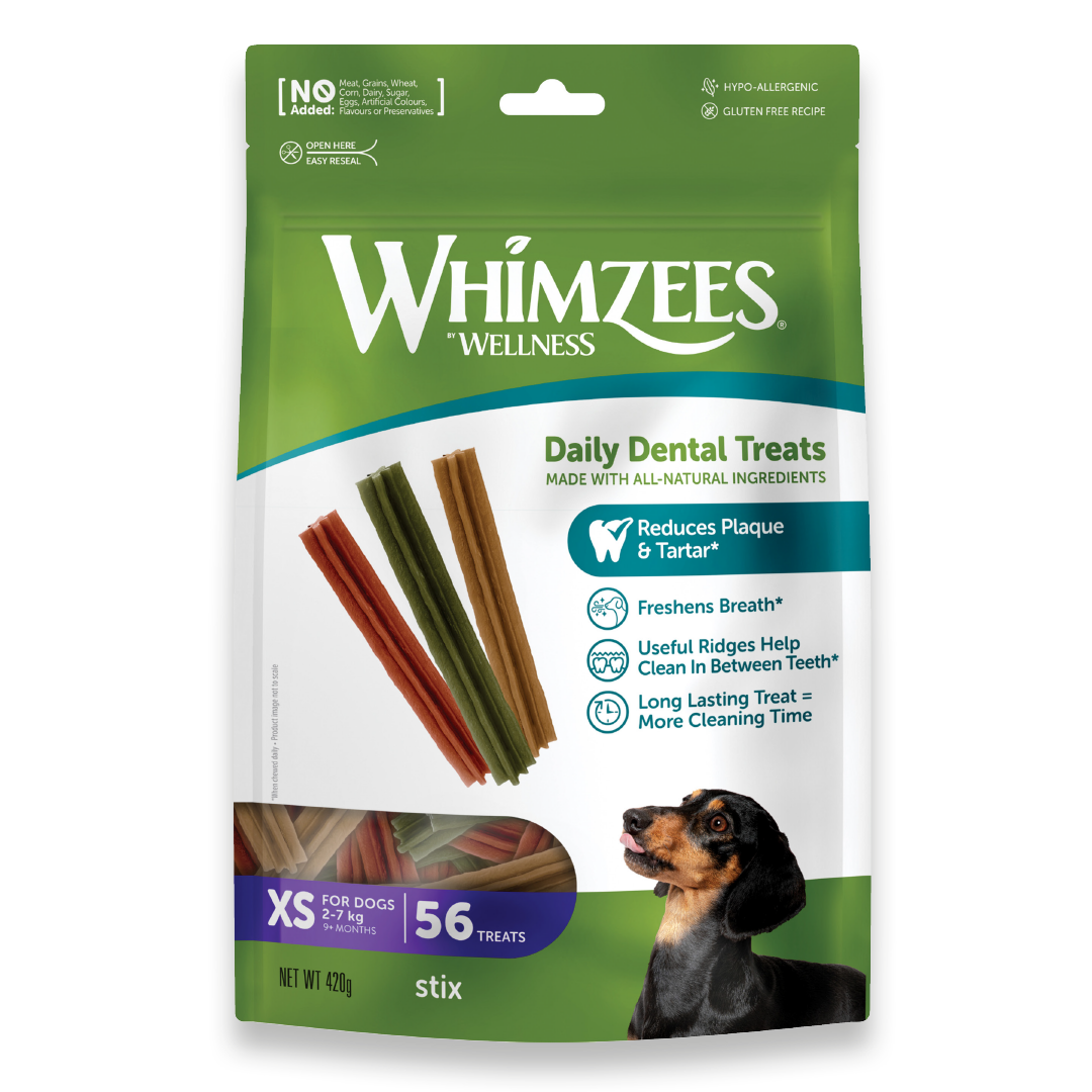 Naturlige tyggebein som bidrar til å bekjempe bakteriene som forårsaker dårlig ånde. Tyggebein fremmer god tannhelse og et sunt tannkjøtt, samtidig som det er en morsom aktivitet for hunden. Whimzees Stix er rik på vitaminer og antioksidanter, har et lavt fettinnhold og fiber som bidrar til god fordøyelseshelse.