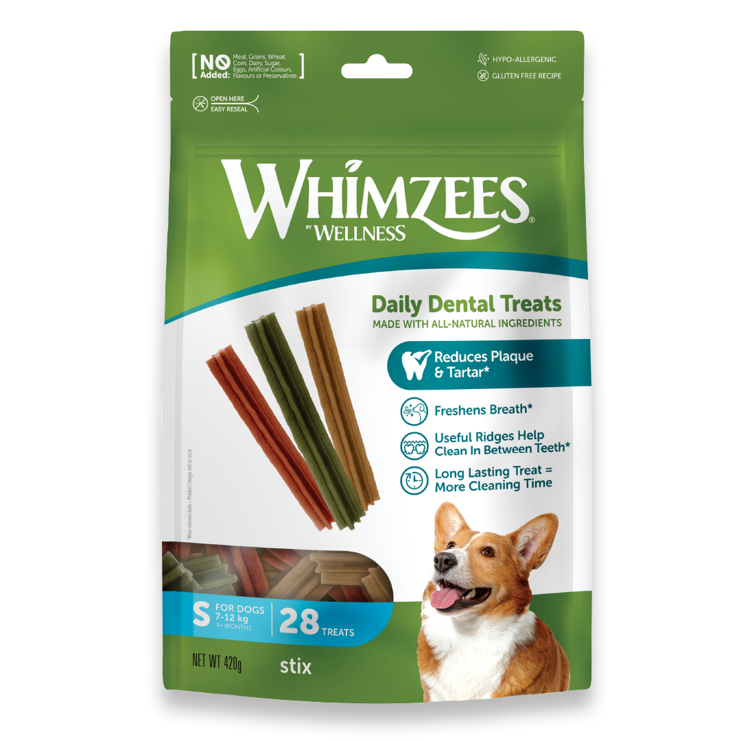 Whimzees Stix er vegetabilske tyggebein som bidrar til å redusere plakk og tannstein hos hunden din.