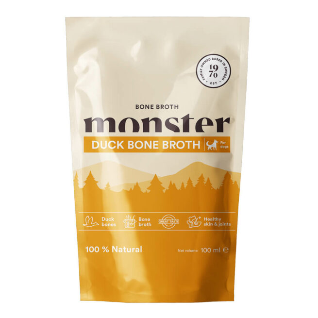 Monster Dog Bone Broth And er en næringsrik og smakfull buljong kokt på andebein. Den tilfører både væske og smak til hundens kosthold, og kan gjøre selv det enkleste måltid mer fristende.