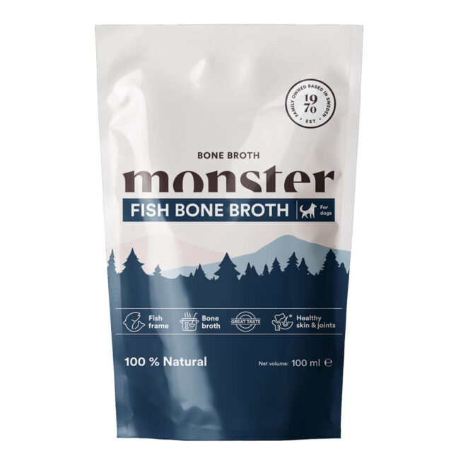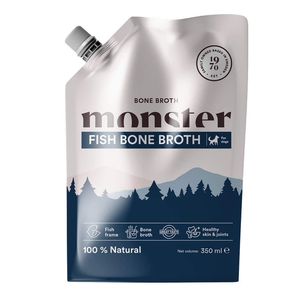 Monster Dog Bone Broth Fisk gir hunden en uimotståelig smak og tilfører ekstra væske i hverdagen. Buljongen er laget på fiskebein og er naturlig rik på kollagen, hyaluronsyre og glukosamin, som støtter bevegelige ledd, sunn hud og en glansfull pels.