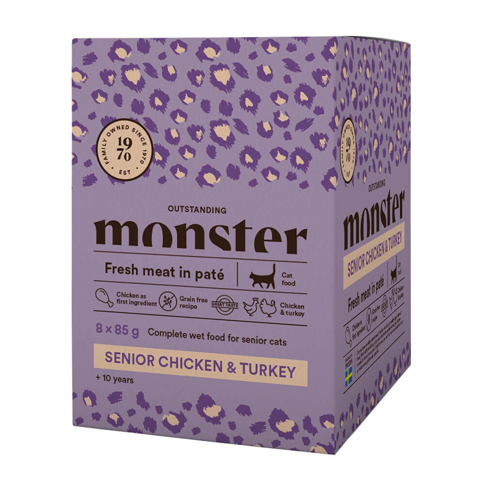 Monster Cat Pouches Senior Chicken & Turkey har praktiske porsjonsposer som gir katten fersk og smakfull mat ved hvert måltid. Dette gjør det enkelt å variere kosten eller kombinere våtfôr med tørrfôr. Den myke konsistensen og rike smaken er tilpasset eldre katter, som ofte kan være mer kresne eller ha behov for mer skånsomme måltider.